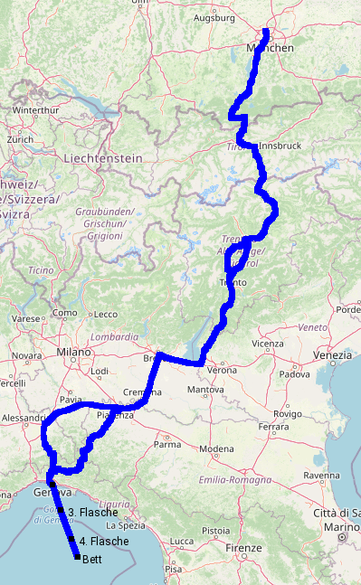Anreise von München nach Genua, mit einem Abstecher nach Südtirol.