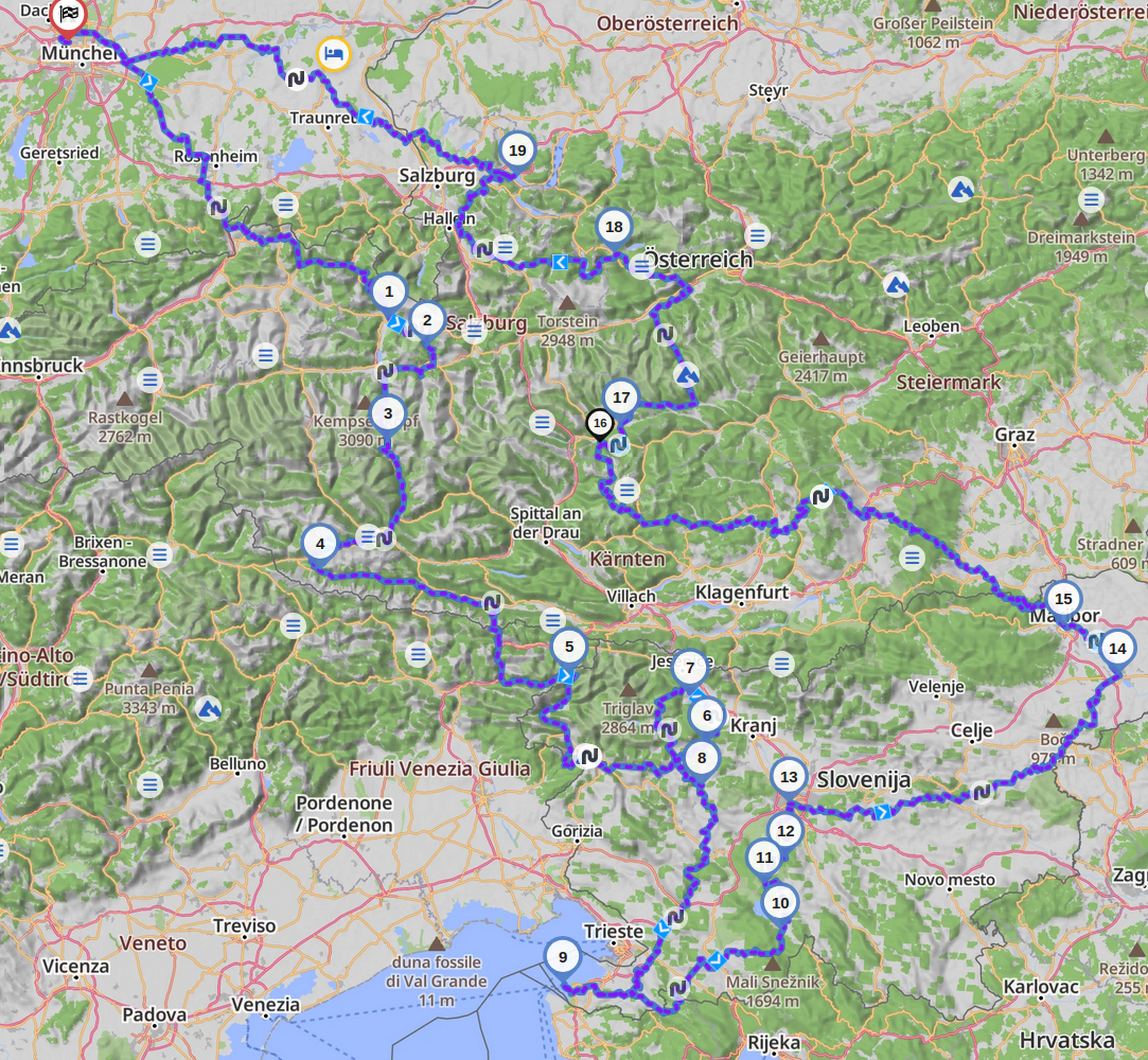 | Tag | Datum | durchfahrene Länder | Wetter | Hotel | [km] |